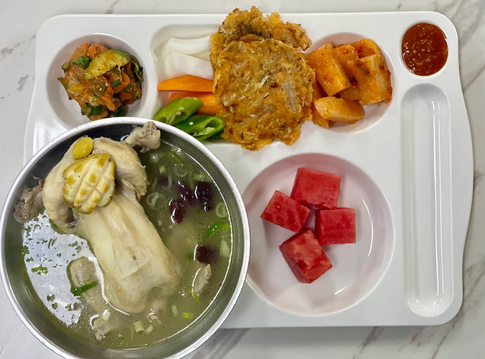 전복삼계탕/광어회무침/야채스틱&쌈장/김치전/석박지/수박